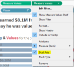 Since my goals was to highlight each players total Surplus, I created a calculated field called ‘Total Surplus’. Because Player is on the column shelf, sorting by Surplus produces the desired effect as though the sort is fixed on Player. For color and size, however, an LOD is required to tell Tableau to account for Total Surplus by Player.